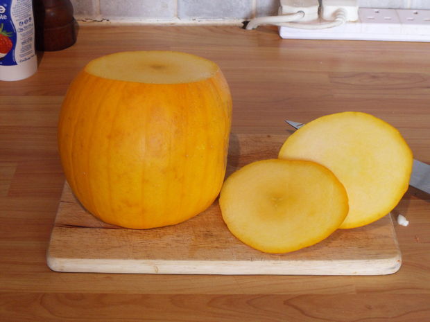 Начинаем очищать тыкву с отрезания верхушки и низа