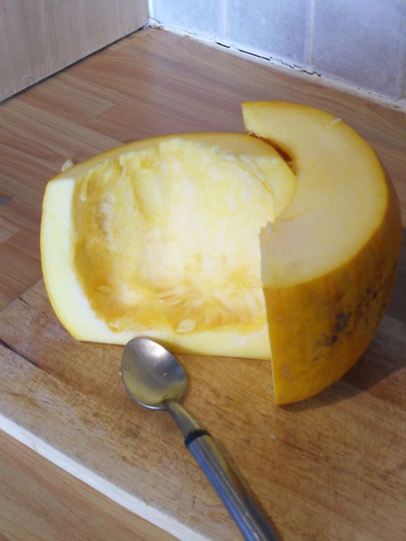 Начинаем очищать тыкву с отрезания верхушки и низа