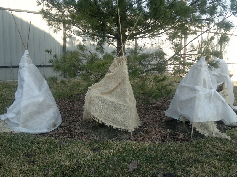 Укрытые на зиму рододендроны