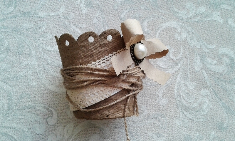 Полоской кружева, наклеенной на картон, оберните горшочек по диагонали