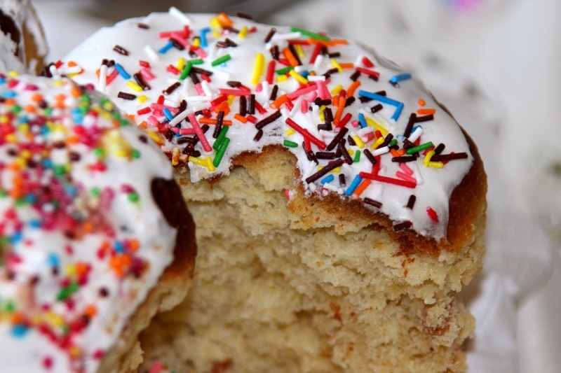 Простой кулич с белой глазурью и кондитерской посыпкой