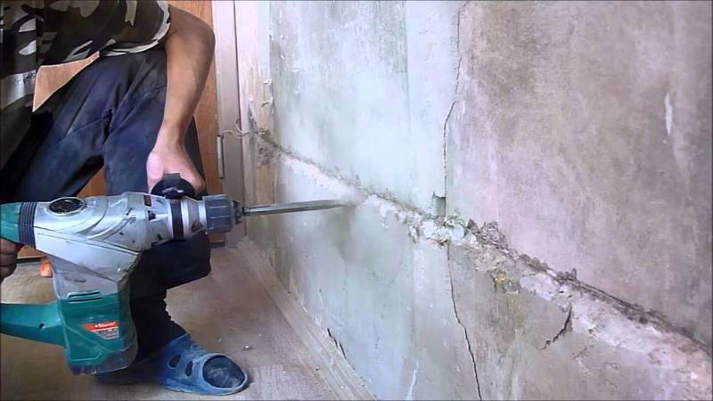 Штробление бетонной стены перфоратором