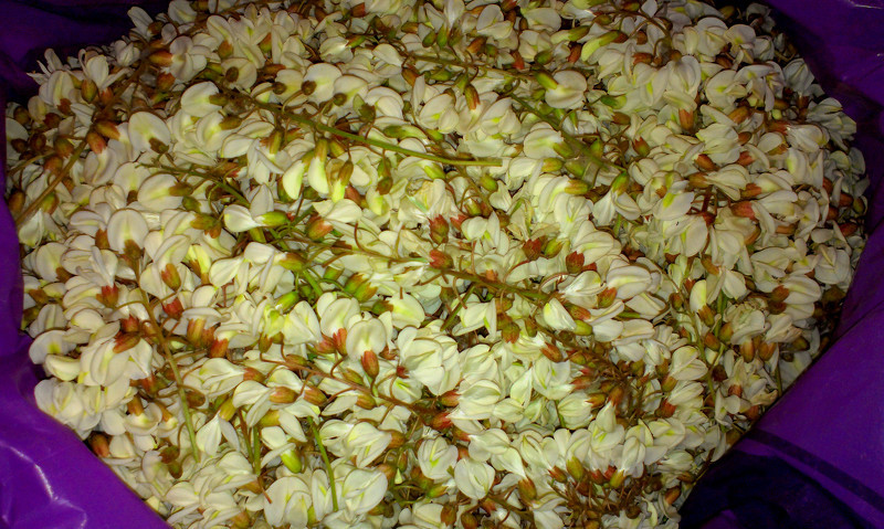 Перебрать грозди акации от листьев и мусора