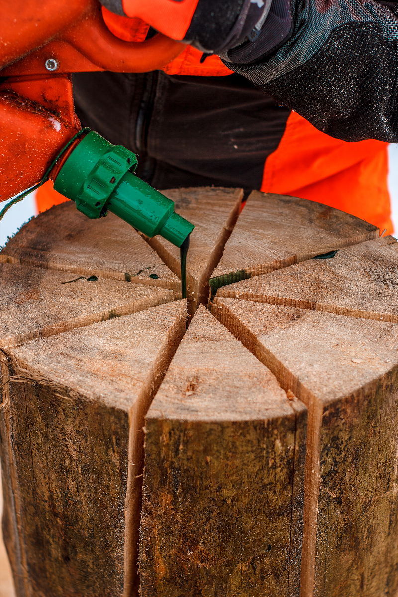 Для розжига заливаем топливо от бензопилы в центр распилов