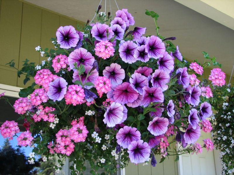 Микс цветов и петунии в подвесном кашпо